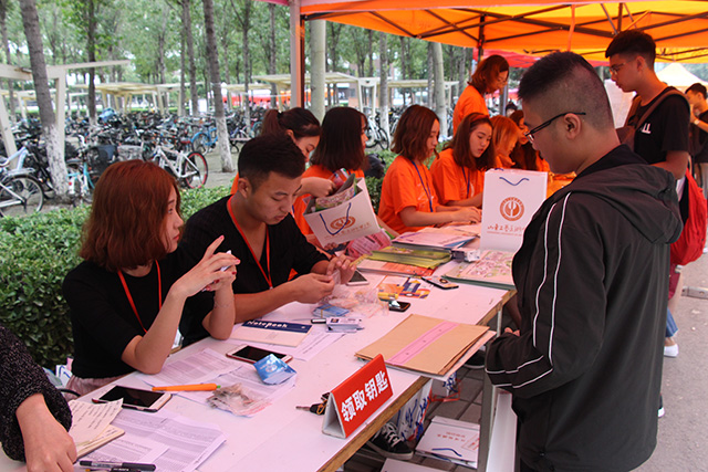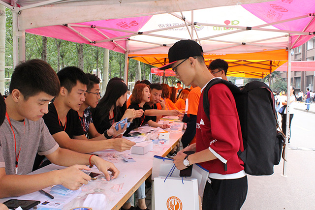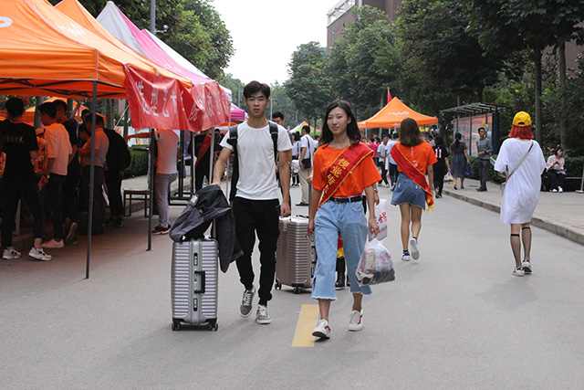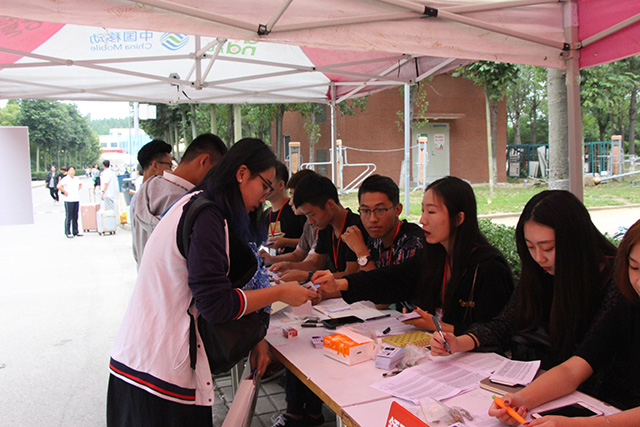 迎新现场,志愿者分工明确,职责清晰,迎新秩序井然。迎新志愿者一一核对学生身份信息,收取档案、入学通知书副本等重要材料,一边发放宿舍钥匙、直饮水卡、学校一卡通、入学须知手册等物品.迎新志愿者中的小伙子,不辞辛苦,一趟趟的为新生搬运着行李,汗流浃背,但仍然笑容满面,热情服务。迎新过程中,由于“今日校园”APP的使用,大大提高了入学手续办理的效率。视觉传达设计学院充分发挥创意思维,创意迎新,为新生做的“设计朋友圈”、“学生证”,以备学生拍照使用,既增强了大学入学的仪式感,又烘托了喜庆愉悦的迎新氛围。