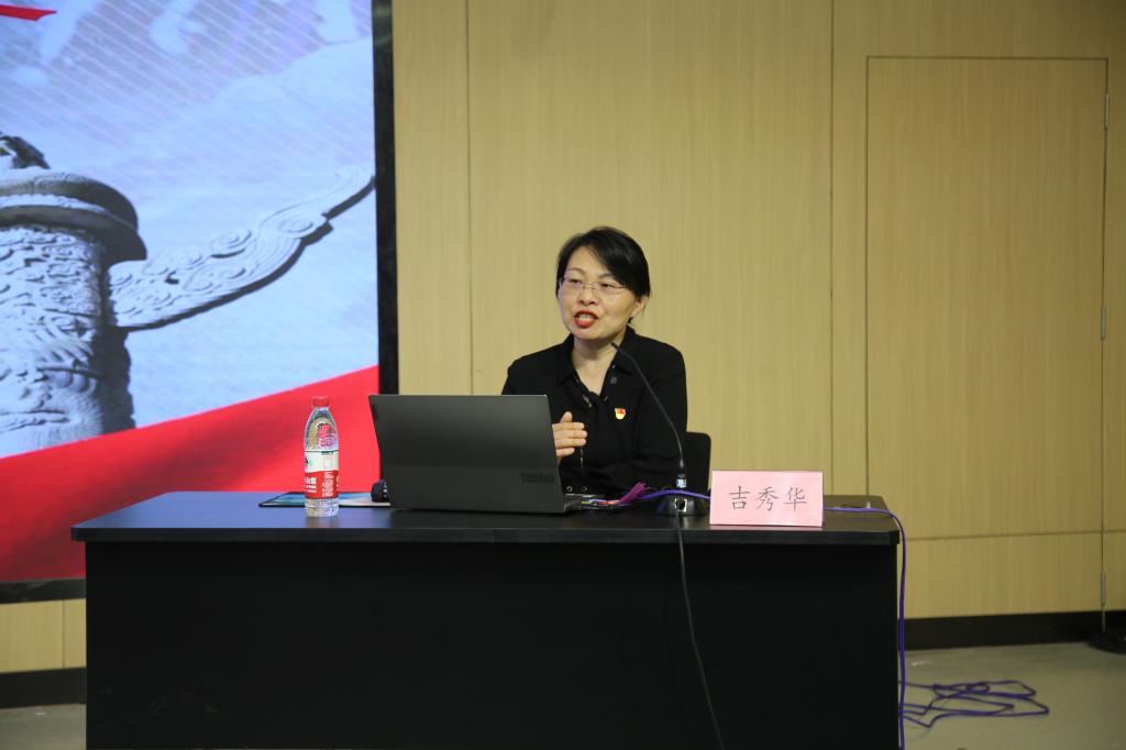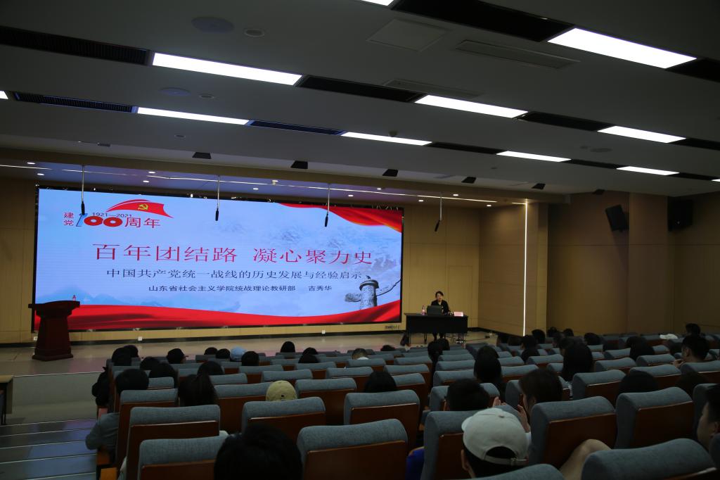 此后,山东省社会主义学院统战理论研究部副主任吉秀华在第一阶梯教室作题为“百年团结路 凝心聚力史——中国共产党统一战线的历史发展与经验启示”专题讲座。吉秀华教授根据不同时期统一战线之于中国共产党的意义,从“根植社会:国民革命统一战线”“占据边缘:工农民主统一战线”“走向中心:抗日民族统一战线”“跃居中心:人民民主统一战线”“巩固中心:建国以来的统一战线”五个方面,层层递进,向大家讲授了中国共产党如何通过统一战线团结朋友、改变力量对比,从小到大、从弱到强,从边缘走到中心的历史。