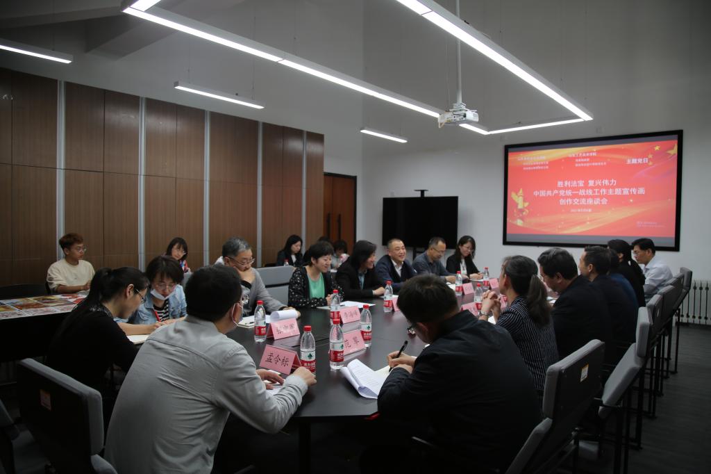 “胜利法宝 复兴伟力”中国共产党统一战线主题宣传画创作展交流座谈会上,视觉传达设计学院副院长王晓峰就主题宣传画创作进展情况进行专题汇报,省社会主义学院的专家一一进行点评指导并提出意见建议,参与创作的教师代表就创作过程中出现的问题开展交流研讨。孙黎海对师生创作给予了肯定,指出将统一战线史系统地与艺术创作相结合是首创之举,具有重要意义。苗登宇强调,创作要紧扣统战主题,要深入理解主题内容、意义,精心打磨作品表现,对应好内容和主题的关系。要在充分理解主题的基础上发挥宣传画设计特有的创作力和表现力,讲求设计的形式感与象征意义,突破完全写实的普通表现,设计手法应更加丰富。孙大刚在主持座谈会时提出,此次宣传画的创作工作时间紧任务重,但是不能疏忽准确性表达,要出精品,抓重点,把握创作进度。