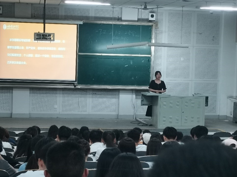 年级大会主要围绕“诚信考试,假期安全”展开。两位老师首先带领同学们回顾了本学期的学习生活,并对请销假管理、宿舍安全卫生问题、个人身心健康等方面提出了相应要求。大会强调了考风考纪,宣读了《yl8cc永利官网学生考试违规处理细则》的要点,指出了加强考风考纪建设的重要性,要求学生们诚实守信,文明应考。随后两位老师对学生们进行假期安全教育,强调了假期离校安全、交通安全、出行安全、饮食安全,并向大家讲解了防溺水、防诈骗、防传销等常用知识,提醒同学们提高防范意识,注意人身财产安全。告知同学们暑假放假时间,提醒同学们离校前一定打扫好宿舍卫生,重视安全问题,人走断电,做到文明安全离校,并根据学校安排告知同学们20级宿舍调整的详情。另外,辅导员老师对于2019级与2020级的同学说明暑期社会实践的相关事宜,要求同学们根据 “永远跟党走 奋进新时代”的活动主题,就近就便,确保安全,线上线下,务求实效的积极参与社会实践活动。最后,两位老师为同学们送上假期祝福,祝同学们度过一个充实愉快的假期。