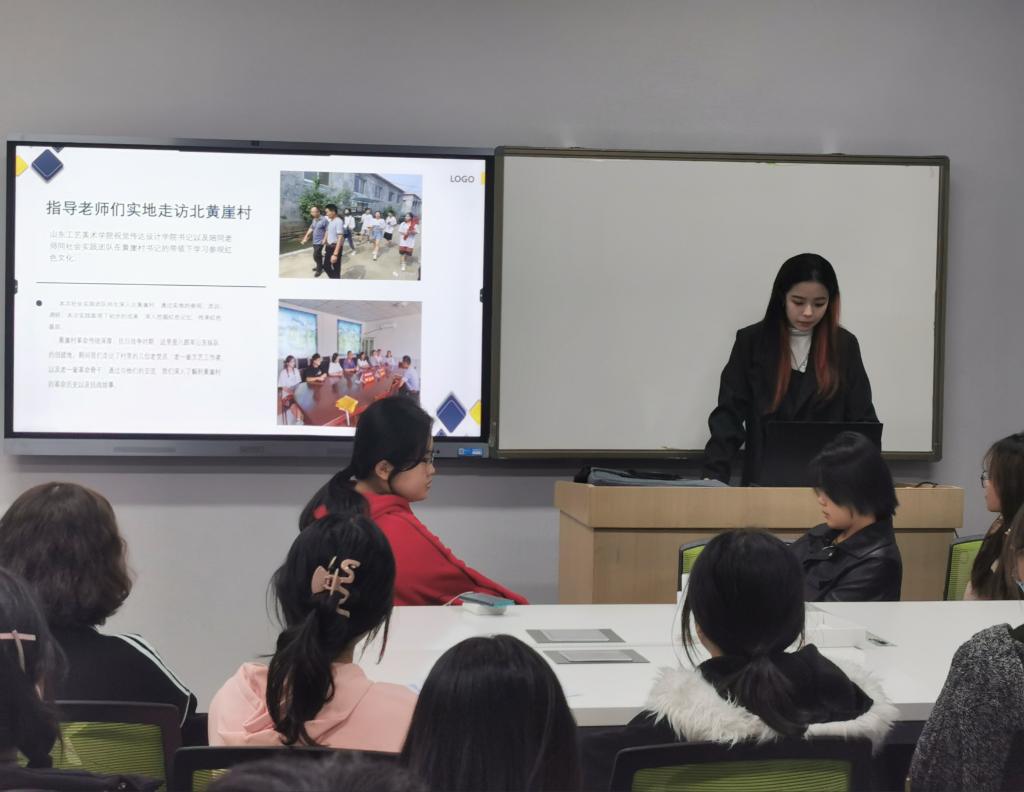 “挖掘红色记忆,传承红色基因”实践队钱俊、石想同学介绍了他们在长清区黄崖村的一周实践时光,介绍了黄崖村的深厚的革命历史故事,以及村中浓厚的红色氛围,与大家分享了访谈对象的抗战故事和小队成员创作的黄崖村红色革命系列作品。他们表示,一周的实践使他们对党的历史有了全新的理解,他们鼓励同学们用青春足迹追寻红色记忆,将尘封的历史鲜活化,做红色基因的传承人。