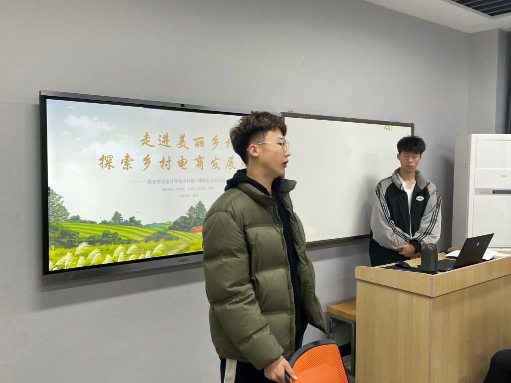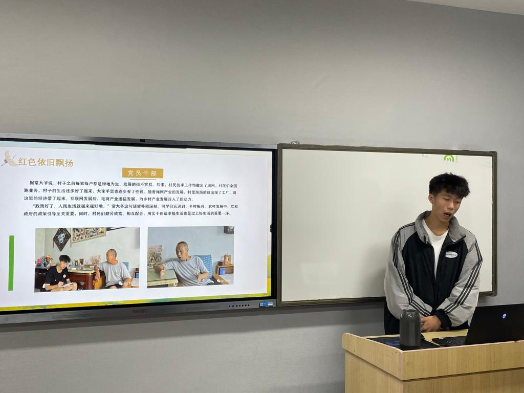 “走进美丽乡村,探寻乡村电商发展良方”暑期社会实践队负责人常文哲、王昊天从“电商兴起之镇,绳网连接世界”、“走访乡村服务工作者,了解乡村振兴新模式”、“老党员干部讲诉乡村变化”、“回归家乡,智造实现乡村振兴”四个方面,向大一同学介绍了自己暑期社会实践小队在滨州惠民县姜楼镇的实践经历,与同学们分享了自己的实践收获,鼓励大家热爱美好家乡,建设美丽家乡。
