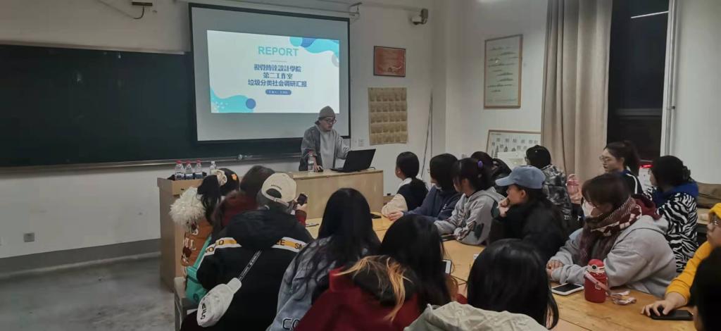 第二工作室实践队队长王鸿远与同学们分享了自己团队的实践成果。暑期,第二工作室同学以“垃圾分类,助力环保”为主题,通过社区实地访谈、问卷调研,了解济南市普通小区垃圾分裂落实情况,发现问题、分析原因,并围绕调研结果开展专业创作,形成了微信表情包、海报等一系列设计成果。他鼓励同学们将开拓思路,发挥专业优势,从现实生活中汲取创作灵感,践行“设计服务生活”的思想。