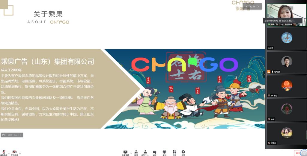 参与本次线上推介会的企业有山东佰城仟物文化产业发展有限公司、福瑞达医药集团、乘果广告集团、红霖视觉设计山东有限公司、海右品牌咨询集团、济南继东彩艺印刷有限公司、山东锐胜品牌策划有限公司等近20家,企业类型囊括设计工作室、品牌公司、综合性企业、画室等。参会企业均经学院精心挑选、联络,专业性强、行业口碑好、岗位优质、长期与学院保持联络和合作。