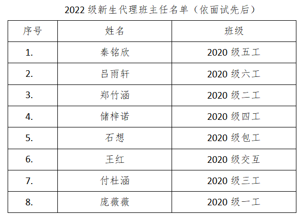 经面试、讨论,最终学院从参选人员中,确定石想等8位同学,担任2022级新生代理班主任。