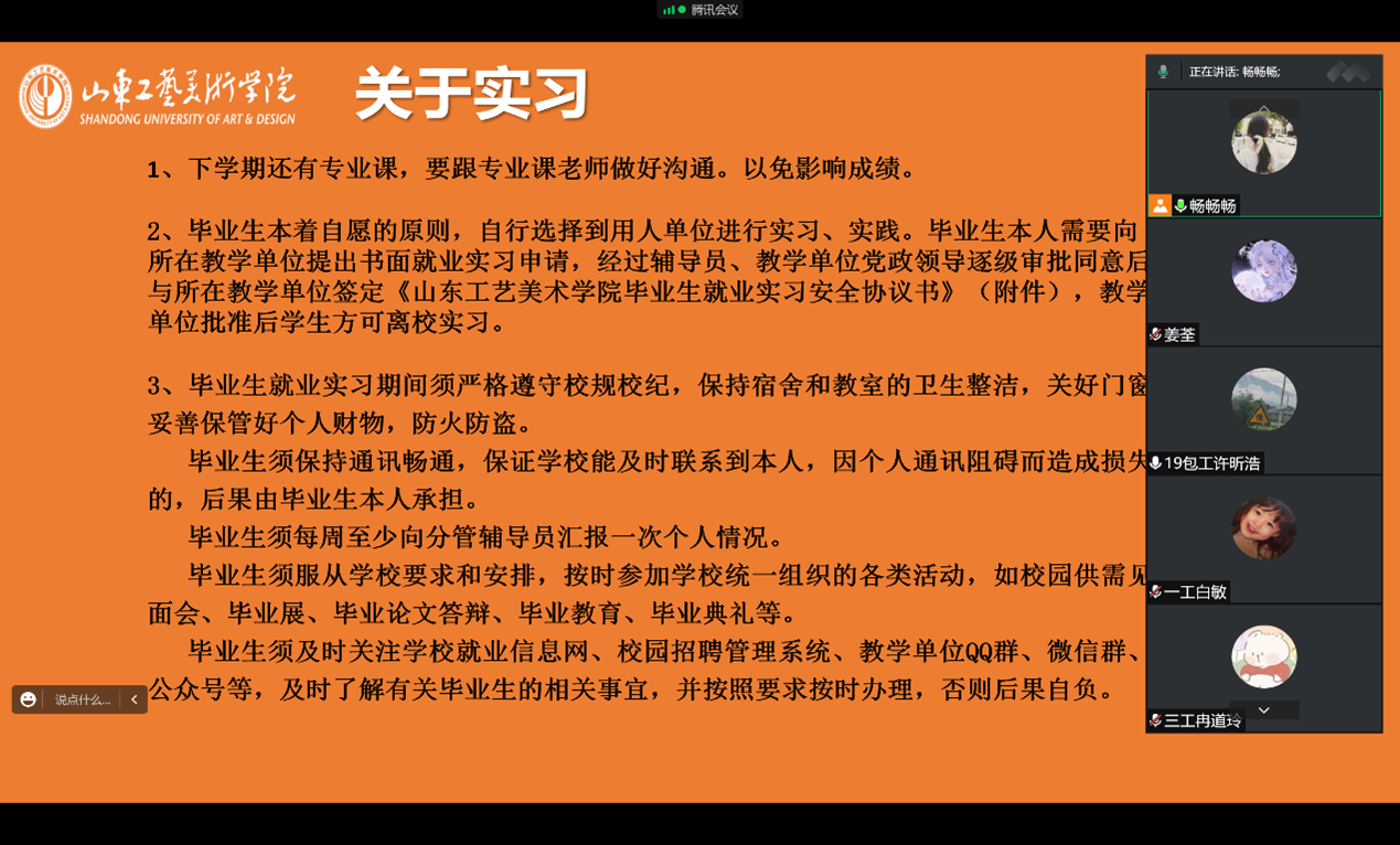 辅导员高畅首先强调了暑期疫情防控要求、离校安全、交通安全、出行安全、饮食安全和求职安全等方面的安全问题,帮助同学们增强安全意识,提高防范能力,做到防溺水、防事故、防诈骗、防传销等。然后,告知同学们新学期安排,要求同学们按时到校报到,做好与家长、老师、同学之间的沟通交流。最后,为同学们解读《yl8cc永利官网毕业生就业实习管理办法》,要求同学们按照学校有关要求进行就业实习。