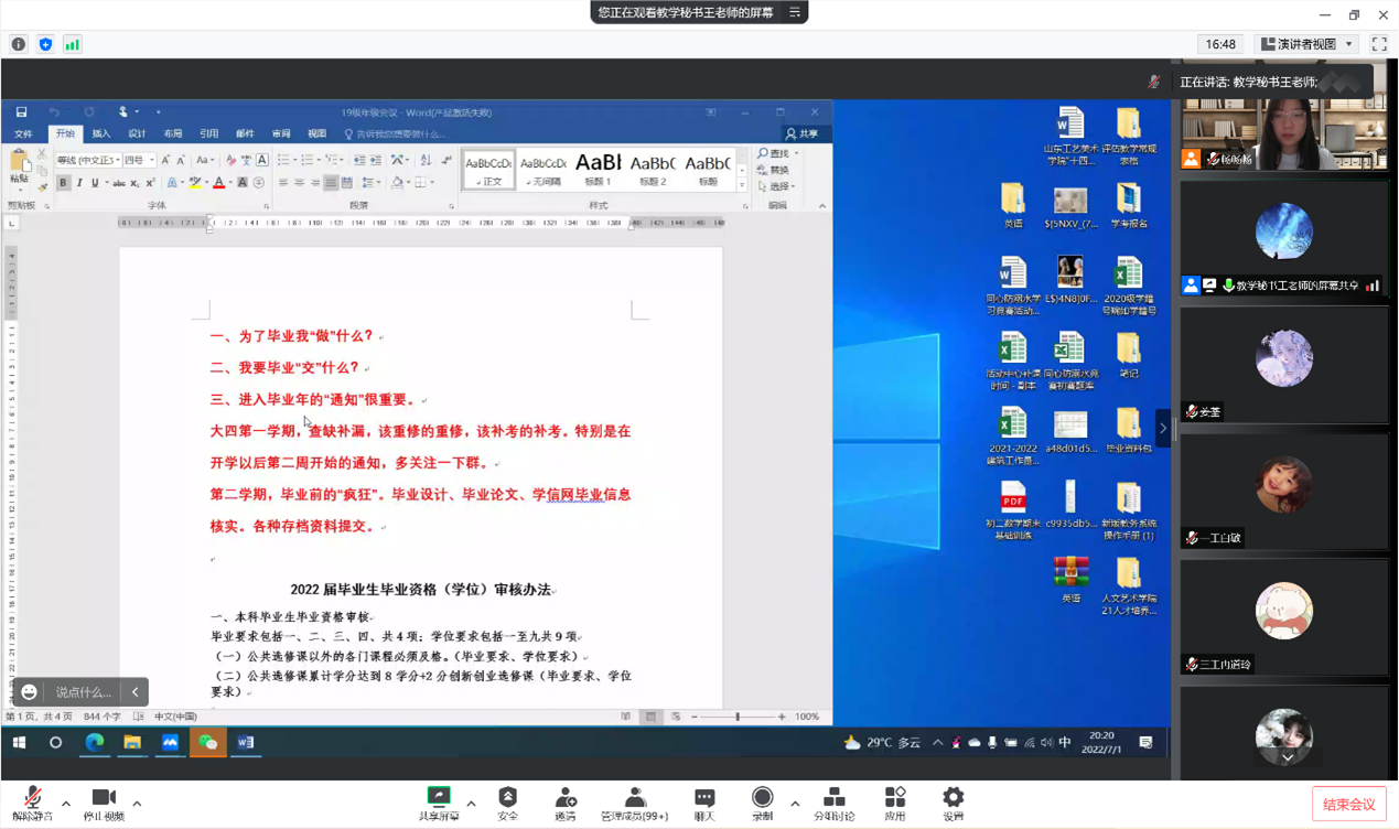 随后,教学秘书王宗艳就学生大四学年各阶段毕业生工作进行介绍,讲解了毕业设计、毕业论文、学信网毕业信息核实等工作的大体流程。同时就公选课以及专业课学分所存在的问题进行指导,提醒同学们及时查漏补缺,做好大四学年的合理规划。