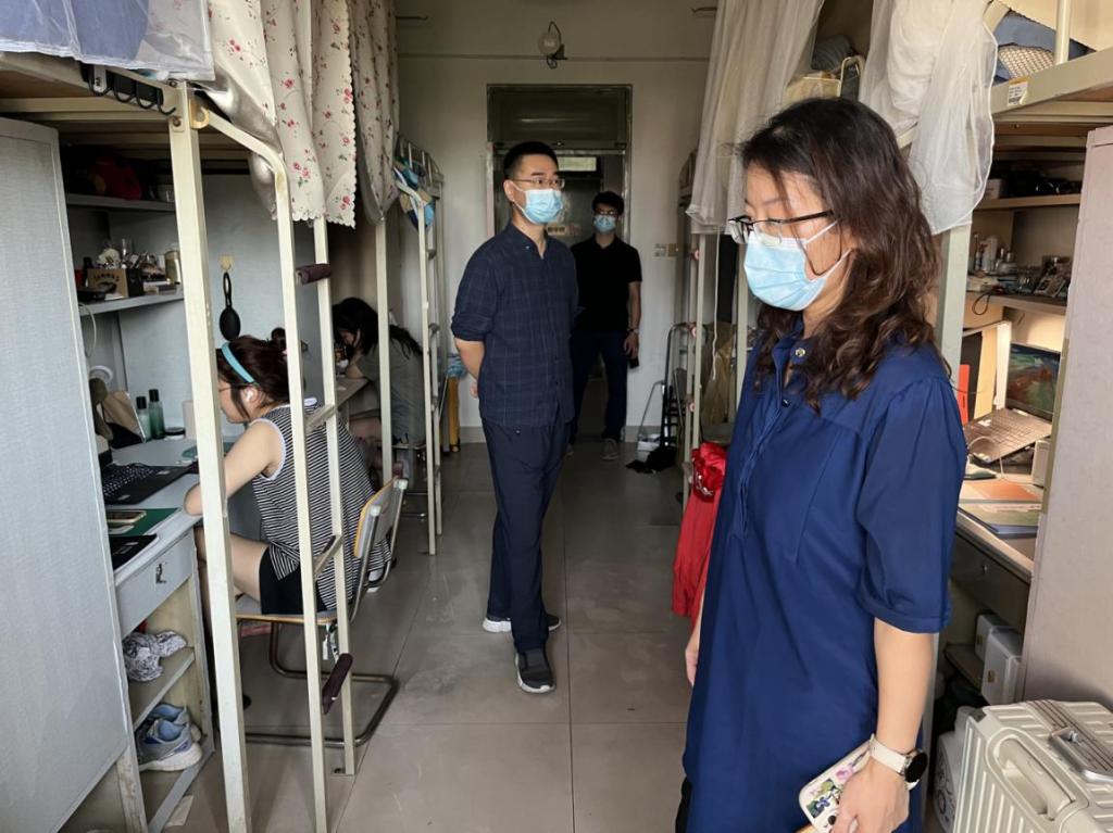 按照学校疫情防控要求,2022级新生入学后实施线上教学。9月19日,为扎实做好疫情防控工作,切实保障线上教学质量效果,同时了解新生入学后的实际学习生活情况和精神面貌,视觉传达设计学院院长王晓峰、党总支书记林波深入学生宿舍,对学生线上学习情况进行教学督导。