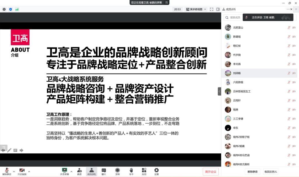 会上,崔鹏老师首先就卫高品牌战略咨询的企业发展、企业理念向同学们进行介绍,并结合公司具体的产品设计项目引导同学们思考策略、设计、市场之间的关系。然后,崔鹏老师围绕结合自身求职就业经历,引出了应届生要如何选择设计相关工作的问题,从就职于不同类型公司的优势与不足两方面展开了论述,增进了同学们对设计行业就业形势的认识。接着从分析个人背景、求职信息以及求职技巧等方面进行了分享,将求职过程中职业选择、简历制作、面试、沟通技巧等环节一一做了细致介绍,干货满满。最后也对想要自主创业的同学提出了自己的建议。