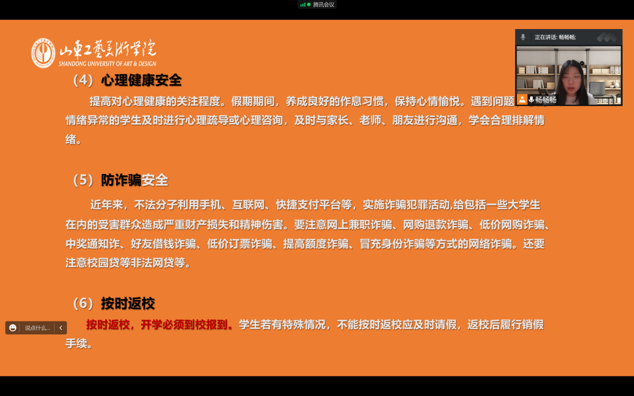 会议对安全教育核心要点进行了强调。一是引导学生安全有序流动,避免前往疫情高流行地区探亲、旅游,出现发热、干咳、乏力、咽痛等症状的学生做好个人防护,减少与其他人近距离接触,及时开展抗原检测;二是加强健康教育引导,引导学生树牢并自觉践行“健康第一”理念,当好自身健康第一责任人,强化学生行为习惯养成,坚持戴口罩、勤洗手、少聚集,做好室内通风消杀,强化感染学生康复期健康指导,加强身体锻炼,保持合理膳食,践行健康生活方式,提升健康素养和自我防护能力;三是做好关心关爱和服务保障,团学干部要及时掌握同学思想动态,帮助学生理性面对疫情造成的挫折和困难,避免过度担忧或恐慌心理,配合老师开展心理摸排,及时了解掌握同学心理状况和现实困难,学院利用微信公众号平台,结合居家期间可能产生的心理波动,制作专题推送,加强学生自我调适能力;四是充实假期生活,开展形式多样的假期活动,如春节系列视频征集、手绘、手工艺制作等,同时,鼓励同学在做好防护基础上,尽己所能参与“返家乡”社会实践,在服务中提升自我。