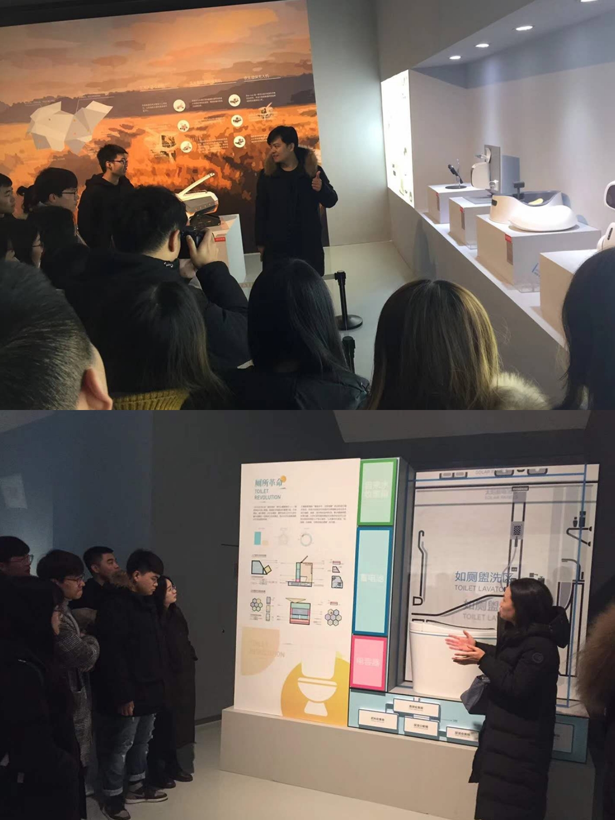 现场教学中教师带领学生参观展品并对展品进行了详细深入的介绍,通过案例教学与范例教学的方式,真正实现了课堂与实践相结合,激发了学生的兴趣。《设计基础》课程的教师为学生讲解了“泰山设计杯”文化创意大赛获奖作品“知了U盘”,该作品以儒家文化为设计元素,精美外观透露出儒雅之气;《设计表现》的学生在教师的带领下观摩一套由玉米青竹饲料收割机、农用大蒜收获机、植保无人机等组成的《新农机设计》,该设计被参观者誉为设计领域的“农具革命”,它立足农民生产生活,深入农耕应用环节,关注经济作物机械用户的使用体验,提高了农业设计解决方案的专属性;《产品设计》的教师讲解了设计作品《ACCOMPANY》,该设计提出自行车与公共交通体系相配合,实现自由骑乘、方便公共交通中转、携带以及公共交通车厢内休憩的设计理念。获得了2017年德国IF设计新秀奖的作品;《公共设施系统设计》的教师为学生讲解了“厕所革命”设计方案,设计团队以“美丽乡村,文明创建”为目标,提出了污物独立处理系统、可持续利用资源无害化、多功能集成卫浴一体化的农村入户厕所方案;《陶瓷设计》的教师带领学生观看“上合”中“取尽千峰翠色”的瓷器领会上合精神。形式新颖的现场教学模式加深了学生对设计的理解,引发共鸣,与展品的对话使学生对设计有了不一样的体悟和理解。