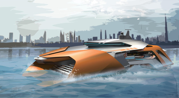 近海子母式高速游艇是一款大型水上娱乐游艇,可携带两艘小艇及其他小型水上交通工具远航,两幅翼的加入增强了适波性,能在水面形成中岛集结地。造型元素取自水生植物随波荡漾的动态,船体线型流畅且富有生命力,体现了人与自然和谐统一。