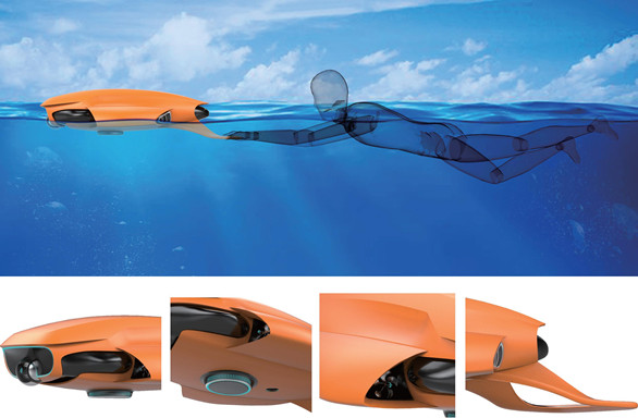 水下多功能潜航器,随着现如今潜水运动的不断发展,水下领域的探索成为许多潜水爱好者以及钓鱼爱好者的一大选择。水下探索时常无法得到信息反馈,给探索者带来生命危险;同时钓鱼爱好者无法获得水下鱼群情况。本设计参考了海洋生物以及功能型机器人的特点,核心功能是:伴随、助力、钓鱼、救援与监测,整体造型提取仿生鳐鱼元素进行功能模块分布,配合人机交互形成界面。