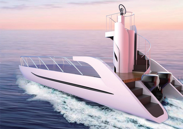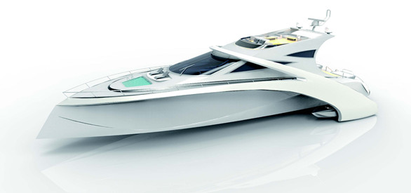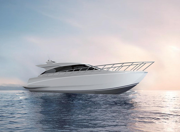 休闲用豪华游艇,是由全铝合金打造的近海游艇,由栏杆、舷线、临水平台到船艏的渐消线和水线带起船的整体动势。同时,飞桥的可延伸设计为临水平台提供更多的遮阳空间。船艏采用深V型, 保证船壳舱室空间扩大, 视觉上具有前进感和速度感。