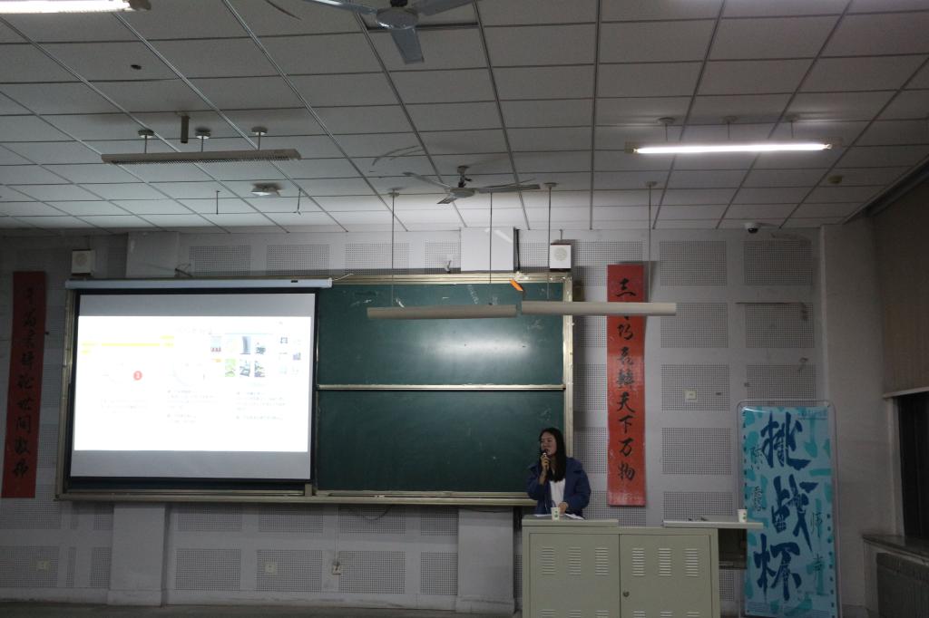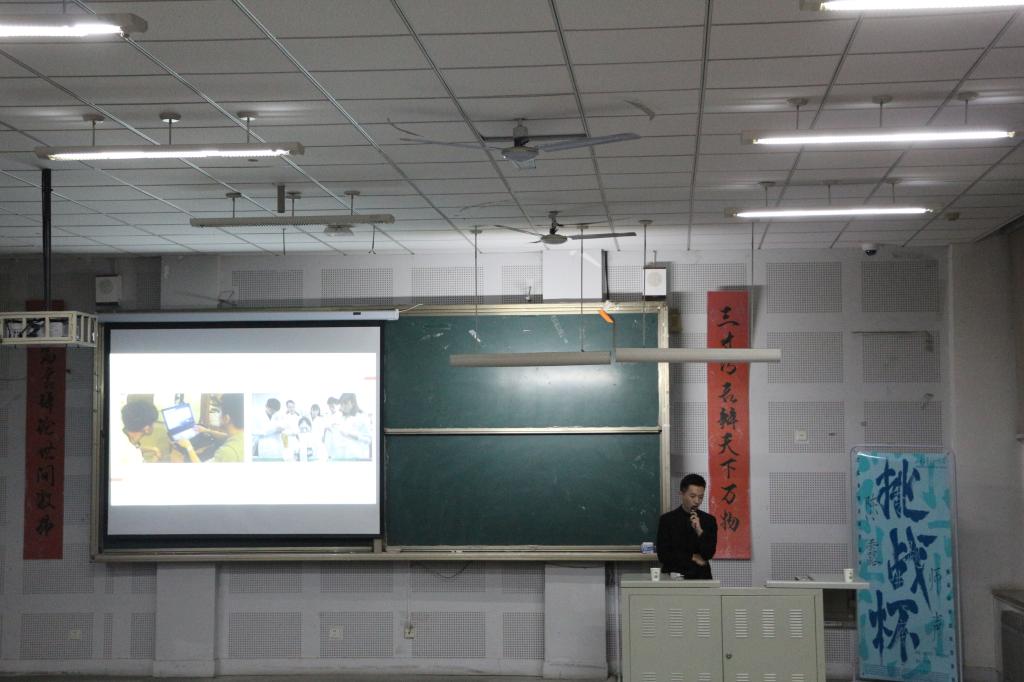 首先,陈露以《三重角度还原“挑战杯”》为题,从“挑战杯”赛事参与者、服务者和组织者三个角度进行讲解。陈露提到:第一,从参与者角度,作为参赛人员要做哪些准备,考虑哪些因素。首先要做个有准备的人,做事负责的人,有耐心的人,并且在整个团体中要做到分工明确,各司其职。第二,从服务者的角度,参赛者要注意哪些点,要遵守哪些“规则”。作为一个团体要有团队的规则意识,作品陈述时要有全面性与连贯性,团队整体呈现出的感觉与项目相“匹配”。第三,从组织者角度来看,整个团队、作品呈现出的各种效果要好。团队要展现大学生风采,体现团队精神。团队的作品要“硬”,要有创新点,充分体现作品质量。反应要快,行动要迅速,不断修改和完善自己作品。然后,师声以《挑战杯”全国大学生系列科技学术竞赛经验分享》为题,从“挑战杯”赛事的选题原则、项目计划书的撰写、答辩PPT的制作以及自己的参赛经验和收获几个方面,详细地和大家讲解了自己眼中的“挑战杯”。两位主讲人的讲座,赢得了在场同学的阵阵掌声。