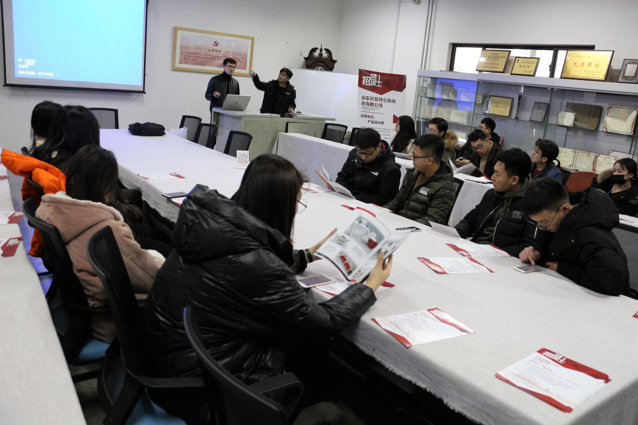 会议开始,招聘单位通过播放PPT宣传片向同学们介绍公司的概况、职业发展方向、人员需求以及选择该单位的理由等。山东长信办公自动化有限公司是一家面向金融企事业单位销售的公司,公司配有专业的销售、设计和售后服务团队,并与国内外知名品牌厂家建立了长期的合作关系。公司主管人员就就业方向以及市场的前景做了重要演讲,并提出需要具有创意和想象力的人员,希望同学们保持对设计工作的热情。最后,主管就同学们提出关于实习期需注意的问题做了详细的解答,并留下联系方式欢迎同学们沟通交流。