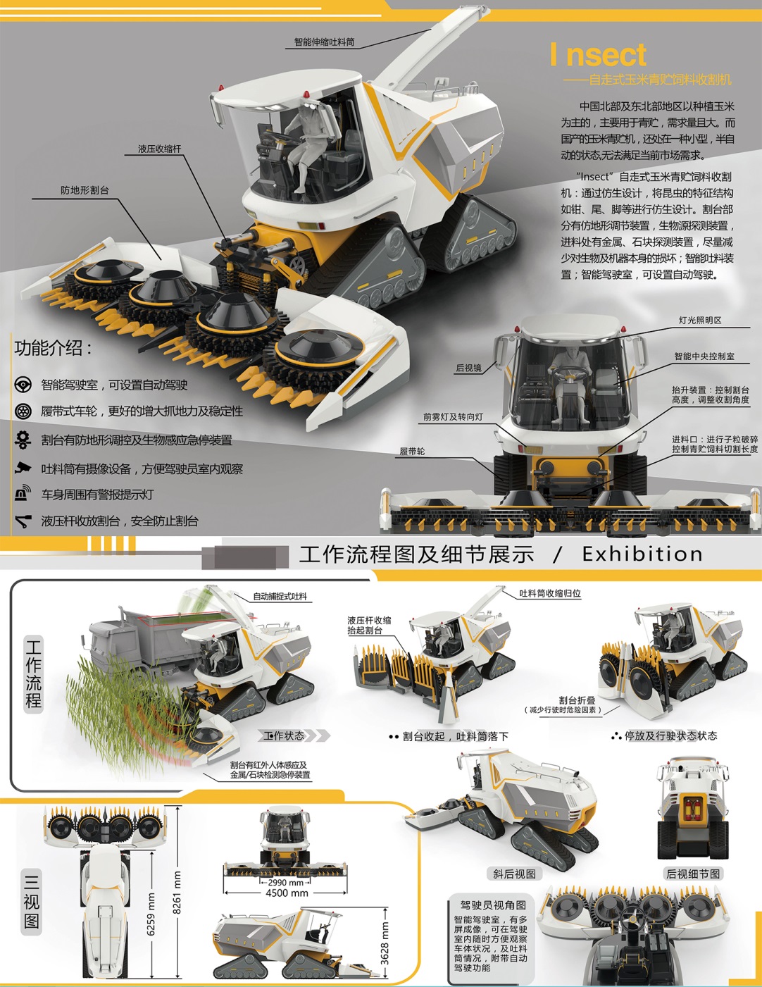 张宇同学设计作品“自走式玉米青贮饲料收割机”在付志伟和王奇光老师的指导下,针对北方玉米农作物青贮作业需求,运用仿生设计方法,结合地形适配、生物探测、智能驾驶与模块化技术,优化车辆结构设计,综合解决了青贮饲料收割机作业、运输与维护的多个难题。