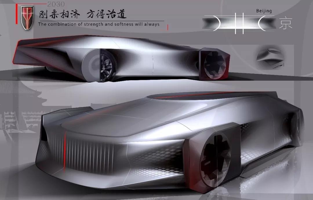 综合提取中国传统建筑的刚性美与柔性美的形式语言,运用到红旗轿跑汽车的造型设计中,通过轮廓线性与光影变化,追寻刚性美与柔性美的平衡点。提取北京故宫屋脊的轮廓平整线性与向上挑起的线性转折特征,塑造车辆均衡挺拔的姿态感和型面转折的力量感与结构感;提取北京天坛硬朗边界与轮廓变化的曲线,为汽车设计中不同型面衔接时产生的的丰富变化提供灵感;综合运用国家大剧院与水面倒影形成的纵向对称的视觉效果,体现太极文化中阴阳结合的设计思想。