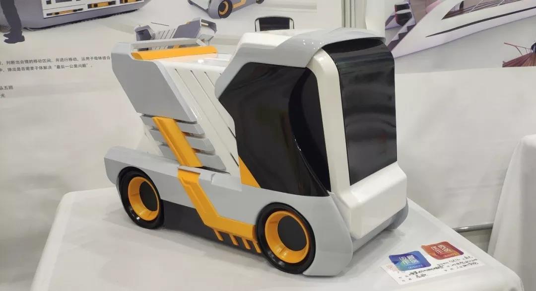 徽派建筑是典型的东方特色建筑,银版相机则是西方摄影技术的开端,在两者中寻找共同点,将传统的东方文化与西方新兴技术相融合,用“星际几何”的设计理念进行造型重塑,将徽派建筑群落重构为具有未来感的几何形态并将相机的独特结构运用到车身中,凸显徽派建筑群落布局紧凑善于利用组合空间、方寸之间可见天地的特点。整车分为前后两个座舱,前端是休闲空间,当旅行摄影师灵感来临时,将车辆设置为自动驾驶模式,座椅向后滑动进入摄影舱,轨道上的摄像机将周围环境投影成像至舱内,摄影师通过手持终端在舱内进行拍摄和后期处理,并可分享到休闲空间的舱壁上。位于前脸的毫米波雷达能够探测前方的地形结构,座舱的连接结构与方形轮罩中隐藏着主动升降悬架。市区模式悬架缩紧压低车身姿态,更符合城市风格。越野模式下车辆根据前方路况自动调整座舱悬架姿态,让摄影舱始终保持水平状态,同时行驶部分的悬架行程增长,提高底盘离地间隙,增强越障能力,保障摄影工作平稳进行。