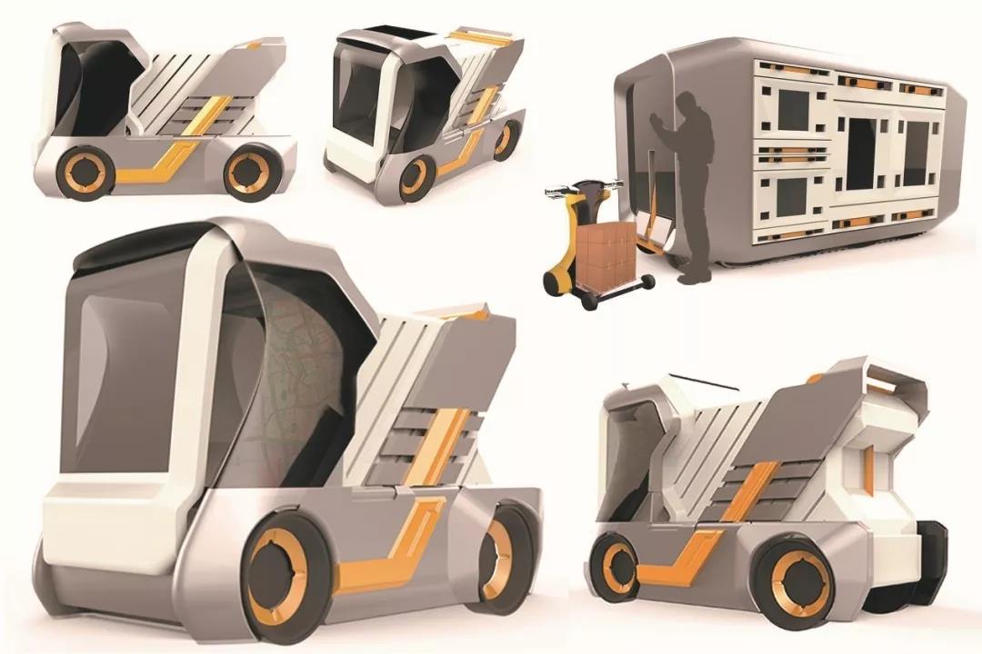 车头设计提取眼镜蛇的造型进行形态仿生,仓储模块设计提取了蜗牛外壳的结构仿生;为了解决配送问题,采用子母体形式,解决物流车单次少量配送的弊端。后轮与舱体的托盘设计,采取半包裹结构,使轮子的变化角度灵活,提高环境适应性;车身整体中部是储存仓模块,运用了伸缩结构,以便于在快递数量增多情况下,合理配送,提高效率。智慧快递柜通过对大数据的分析,选择合适的区间位置,计算合理配送距离,方便送取件。中部快递舱体可根据快递的体积大小,合理配置内部结构,节省空间,从而达到高效化,合理化,智能化。