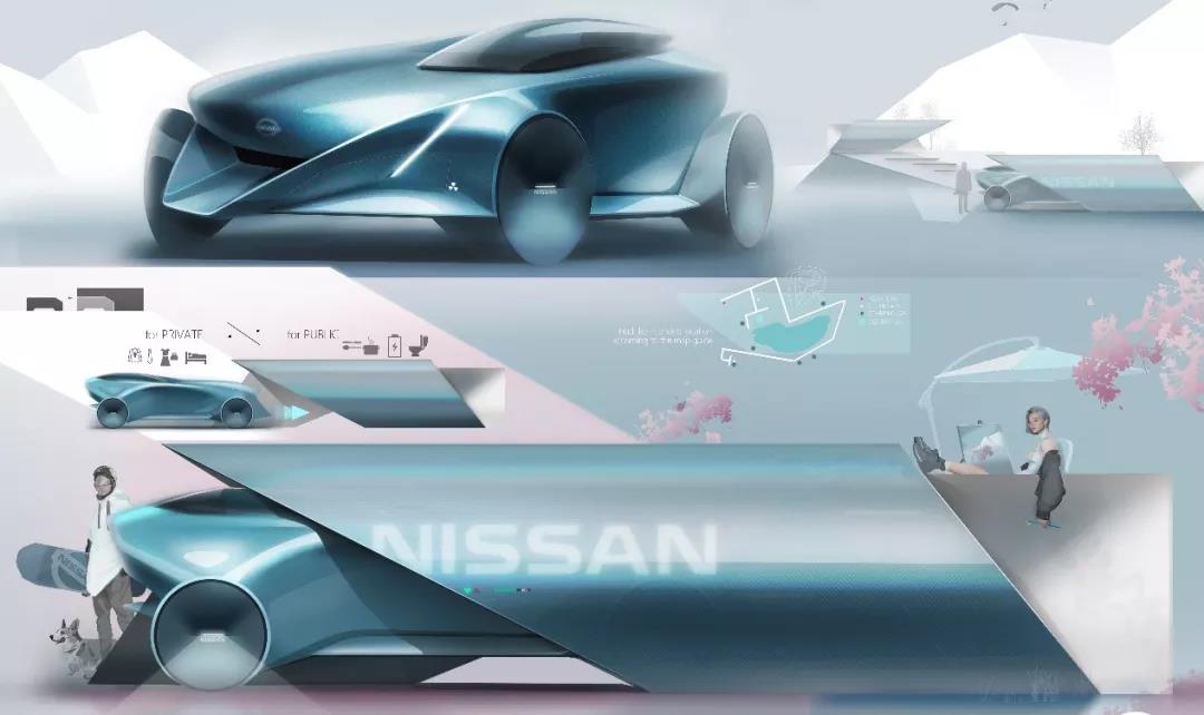 整车采用不对称设计,在有机型体中寻求联系和平衡,整体外观采用对角关联的造型,高度配合车内乘客相对交错而坐的人机布置。侧面造型同样前后交错形态,通过对主副驾驶位的结构调整,使得车辆姿态前低后高,配合贯穿侧面的肩线,营造出富有运动感的车辆姿态。将日产家族的设计语言和型面构成形式融合进全新的设计之中,前脸与车尾采用多功能的内嵌LED屏幕,生成电子车标和其他车辆信息。不仅有装饰作用,更增强了车辆和行人以及乘客的沟通和互联。内部实景模拟的智能车窗在外部封闭的情况下,可将外部景像完整的传递给乘客,保证车辆乘员的私密性,同时省去传统的屏幕与实体按键的交互区域,车窗部位的显示器同时兼具车辆信息的显示以及与乘客的交互功能。整个设计将交通工具放入未来可实现的系统当中,包含未来共享经济背景下的私人交通工具、共享空间的造型设计,以及未来众多生活方式的畅想与规划。