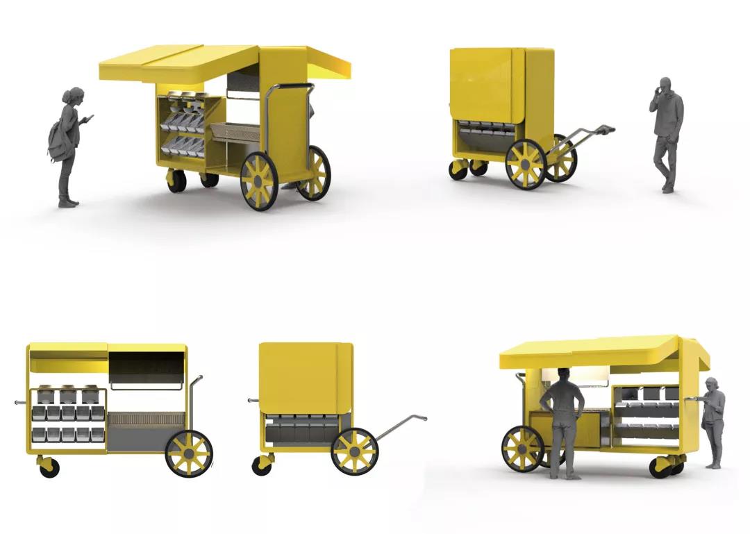 人们在忙碌之前总要从黎明的街头买上这单纯的美好——豆浆油条。豆浆可由购买者自制,油条可短暂控油后快速装取。车体可折叠,可挂于电动车后方,方便移动。
