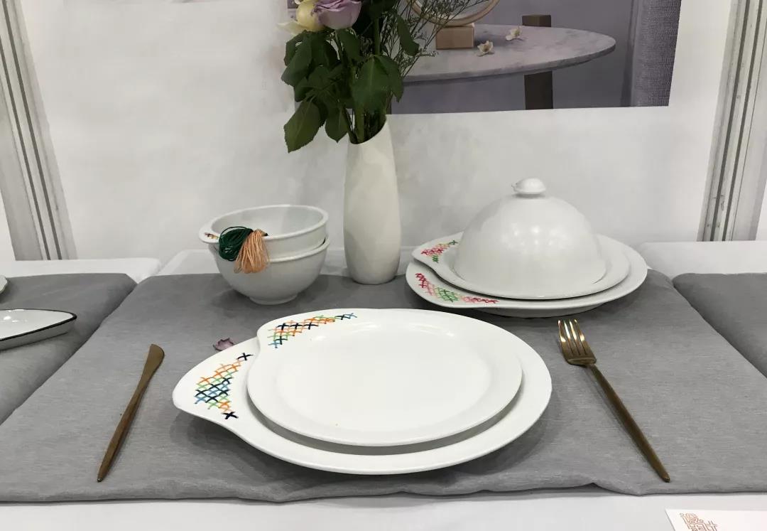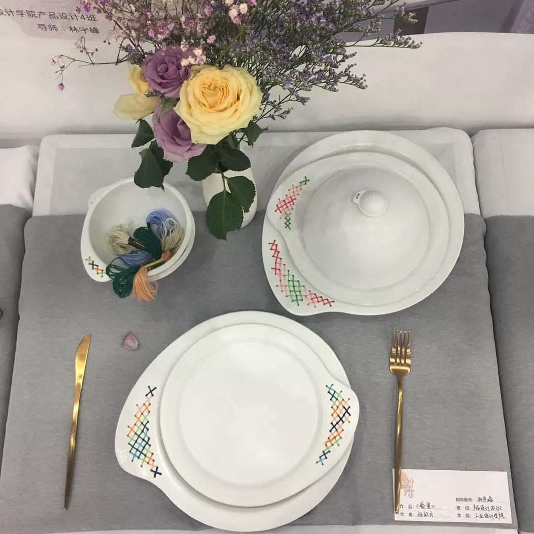 将十字绣工艺与元素融入陶瓷餐具设计中,人们可以根据自己的喜好,自己动手设计与绣制,通过单个餐盘花瓣的造型,层层组合成为寓意盛开的花朵,增添人们产品的参与感与体验感。