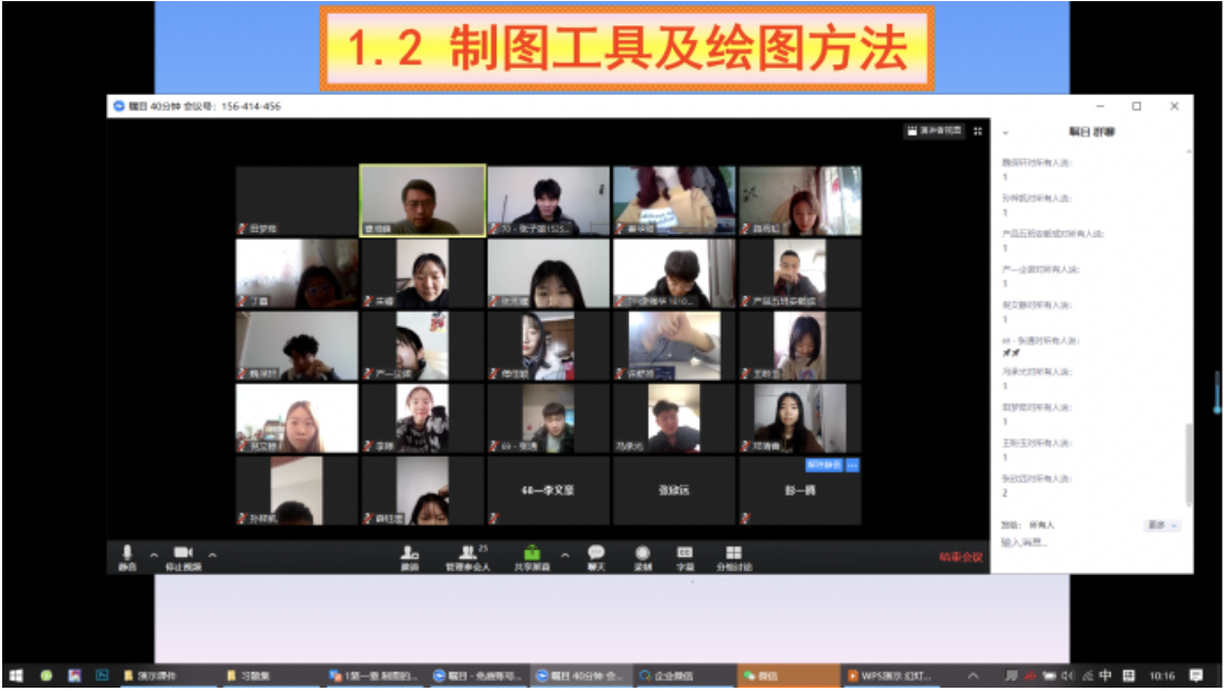 在线上教学过程中,教师们授课思路清晰,深入浅出,重点突出;教学课件制作规范,教学应用效果较好;严格按教学计划进行授课;对学生要求严格,课堂秩序良好;任课教师认真组织学生线上分组讨论与指导,并进行课外辅导;学生参与讨论度较高。同时,教师们以多种方式进行考勤,严格检查学生出勤率,关注学生的课堂体验,积极利用在线视频、微信群等网络工具与学生进行在线互动,在线提问及答疑,关注学生上课的状态与学习体验,学习成果较好,学生参与热情较高。