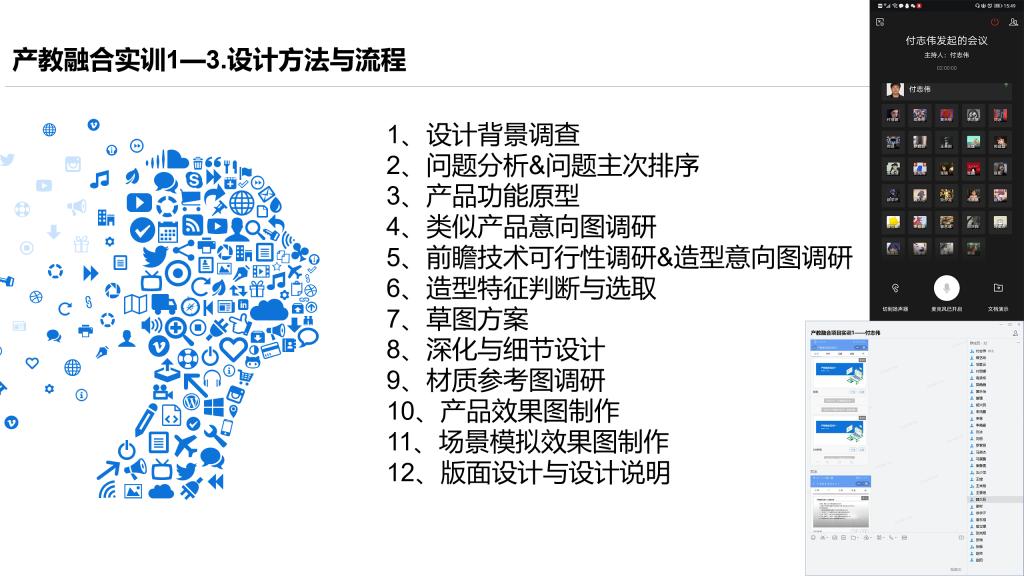 产教融合项目实训1课程是一门综合实践课程,授课老师针对实践课程远程设计辅导困难等问题,线上教学采用瞩目app视频会议、长江雨课堂+企业微信在线会议等灵活教学方法,系统讲解设计目标选择、设计调研、功能原型等知识点,配合丰富的设计案例,深入讲解设计实践流程,同时与学生语音互动,教学反馈较好。通过企业微信小组,课后师生资料共享,设计讨论、答疑顺畅。