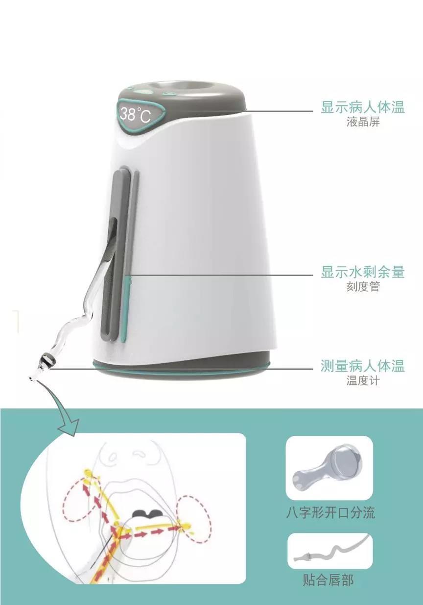 该设计在恒温热水壶的基础上,增加了外伸吸管,吸管上集成体温探测器。平躺的患者不需起身即可通过外伸吸管自行喝水,喝水端的温度传感器可直接探测病患的体温并反馈给医生,医生通过接收器可实时观测病人体温的动态情况。