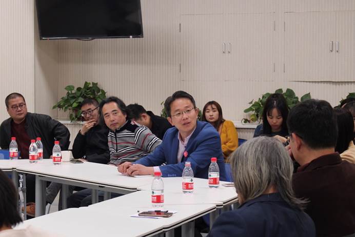紧接着,学院教师张震以画家到设计师、艺术家的身份转变,发表了自己的看法,感慨当今网络时代对艺术的改变,又对校友和老师们寄予了厚望。