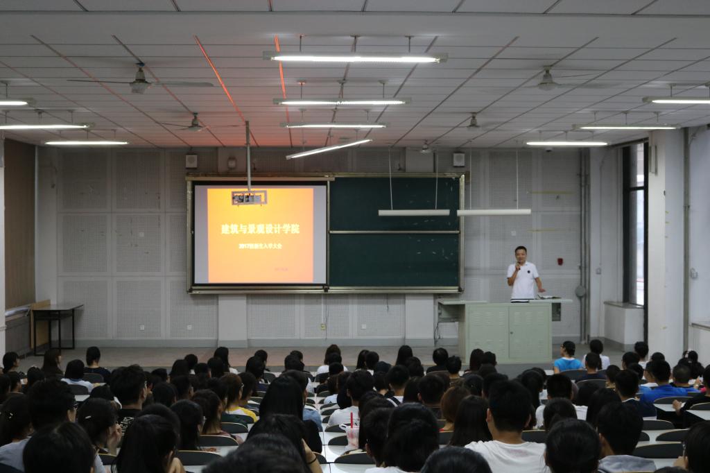 当晚,建筑与景观设计学院还召开了2017级新生年级大会,会议由辅导员杜鹏主持。首先杜鹏做了自我介绍,对各位新同学的到来表示热烈欢迎,并向全体同学逐一介绍了代理班主任。随后,他为同学们介绍了学校的基本情况,播放了学校宣传片。他向初入大学校门的同学们提出了三点建议:一是要有梦想,有目标,不断指引自己前进的方向;二是要学会学习、善于学习,不断丰富自己将来立足社会的技能;三是学会生活,善于沟通。他鼓励同学们要爱校荣校,与学校一起努力,共同发展。最后他特别强调了要遵守纪律,强化宿舍管理,嘱咐同学们注意宿舍用电安全,谨防偷盗、诈骗等犯罪,学会自我防护。大会最后,杜鹏祝愿各位2017级新同学能在学校学有所成,大会在掌声中结束。