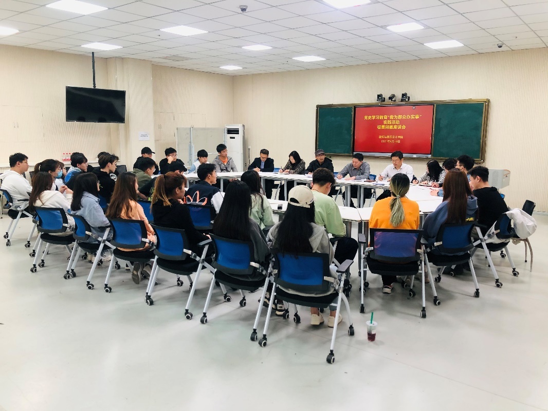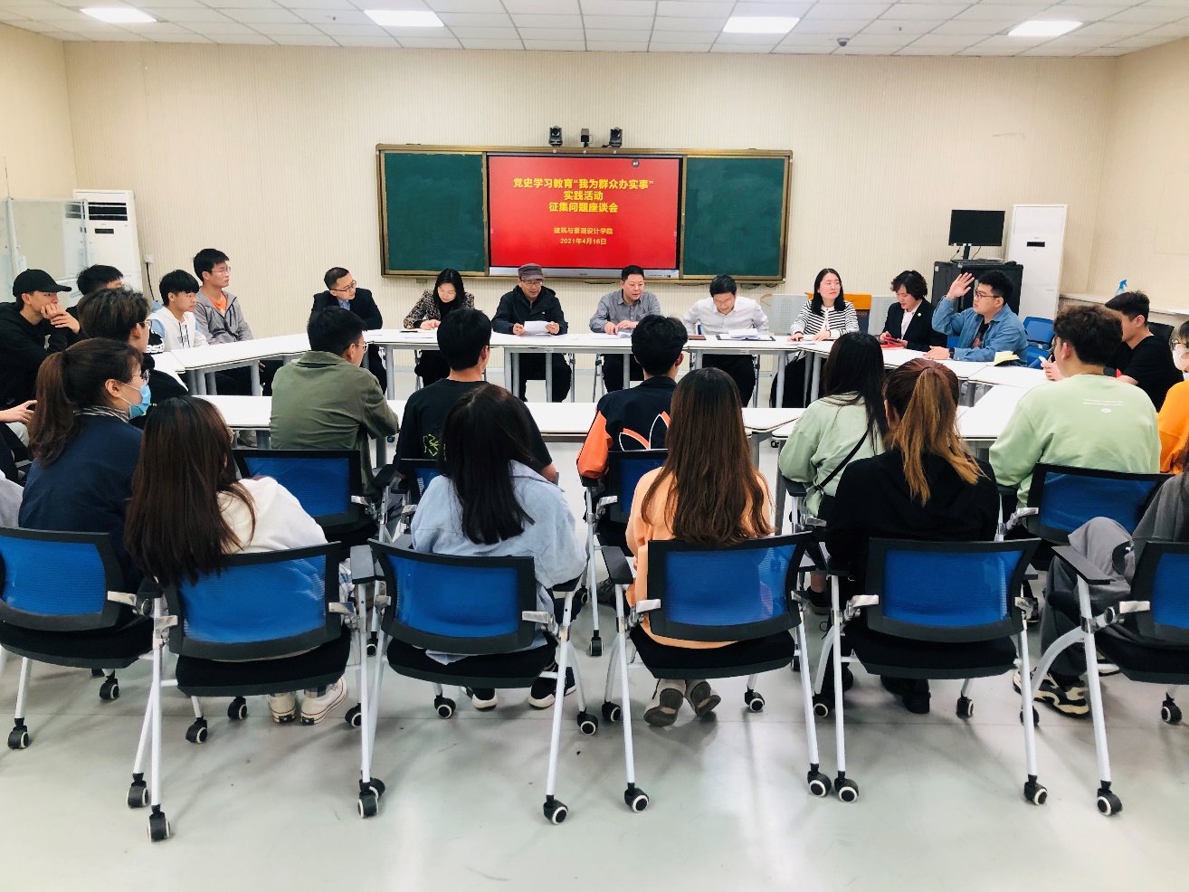 4月16日,建筑与景观设计学院党史学习教育“我为群众办实事”实践活动座谈会,征求同学们的意见建议,党委委员、党委组织部部长许磊、学生处处长张军波、团委副书记孙艳丽、山东明德物业管理集团总公司yl8cc永利官网项目部学生公寓主管徐楠、辅导员褚丁庆、陈铁参加会议,党总支书记张东深主持会议。
