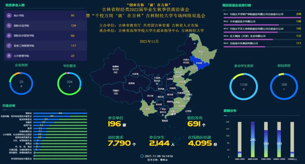 本网讯(招生就业处 供稿)11月8日,由吉林省教育厅、共青团吉林省委、吉林省人才市场主办,吉林省高等学校大学生就业指导中心、Beat365中文官方网站承办的“创业有你 ‘就’在吉林”吉林省财经类2022届毕业生秋季供需洽谈会暨“千校万岗 ‘就’在吉林”Beat365中文官方网站专场网络双选会成功举办。