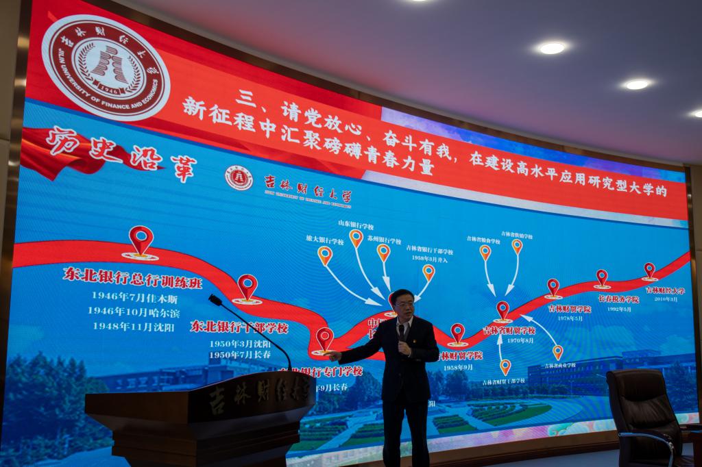 随后,校党委书记孙杰光以《认真学习贯彻党的十九届六中全会精神 弘扬伟大的建党精神 培养造就新时代财经英才》为题,从“请党放心、强国有我”、“请党放心、振兴有我”、“请党放心、奋斗有我”三个维度,以世情、国情、省情、党史党情、校史校情五个视角讲授了一堂精彩的思政课。首先,孙杰光带领全体青年师生深入学习了党的十九届六中全会精神。他说,这次全会是在我们党成立一百年的重要历史时刻,在党和人民胜利实现第一个百年奋斗目标、全面建成小康社会,正在向着全面建成社会主义现代化强国的第二个百年奋斗目标迈进的重大历史关头召开的。全会通过的《中共中央关于党的百年奋斗重大成就和历史经验的决议》是一篇马克思主义的纲领性文献,必将对推动全党统一思想、统一意志、统一行动,团结带领全国各族人民以史为鉴、开创未来,埋头苦干、勇毅前行,在新时代更好坚持和发展中国特色社会主义、实现中华民族伟大复兴产生重大而深远的影响。《中共中央关于党的百年奋斗重大成就和历史经验的决议》时间跨度长,涉及范围广,阐述了党的新民主主义革命时期、社会主义革命和建设时期、改革开放和社会主义现代化建设时期和新时代中国特色社会主义时期所取得的伟大成就,发生的历史性变革,全面总结了我们党百年奋斗五个方面的历史意义和10个方面的历史经验,特别是总结了其中的原创性思想、变革性实践、突破性进展和标志性成果,对成就梳理全面,对经验分析透彻,充分展示了马克思主义的强大生命力,增强了全党锚定既定目标,意气风发走向未来的勇气和力量。其次,在“请党放心、强国有我”第一个大问题中,孙杰光讲述了如何从“四个伟大成就”中,汲取砥砺前行的力量,如何从“五个庄严宣告”中,读懂中国全面小康的伟大光荣,如何从“伟大建党精神”中,体悟中国共产党人鲜明的政治品格,如何从“九个必须”中,解锁武装头脑、真抓实干的实践密码等四个方面问题,他强调指出,中国共产党建党求什么?坚持真理、坚守理想;中国共产党立党为什么?践行初心、担当使命;中国共产党兴党凭什么?不怕牺牲、英勇斗争;中国共产党强党靠什么?对党忠诚、不负人民;再次,在“请党放心、振兴有我”第二个大问题中,孙杰光从历史维度回顾了东北发展历程,强调要深刻领会习近平总书记关于东北全面振兴的殷切期望和目标定位;从战略维度分析了东北全面振兴面临的机遇挑战,指出如何准确把握习近平总书记关于东北全面振兴的重大判断;强调要从实践维度把握新发展阶段、贯彻新发展理念、构建新发展格局,推动高质量发展,确保实现习近平总书记提出的东北振兴“十四五”时期要有突破、要有战略性举措的目标。他强调指出,东北振兴面临“习近平总书记亲自擘画新时代东北全面振兴的战略性机遇”、“党中央全力支持东北振兴的政策性机遇”、“深化东北亚经济合作、扩大开放的机遇”、“新一轮科技革命带来的创新机遇”等四大机遇,具有“制造业优势,商品粮基地优势,沿边近海优势,生态环境优势,科教人文优势”等五大优势。为贯彻落实习近平总书记 “构建优势互补高质量发展的区域经济布局”“加快推进长吉一体化发展,培育发展现代化都市圈”的总体要求,吉林省委制定了“一主六双”高质量发展战略,力争要在“构建优势互补高质量发展的区域经济布局、培育长春都市圈城市群”、“构建多点支撑、多业并举、多元发展的产业发展新格局”、“新基建‘761’工程、交通强省等‘两新一重’项目投资”、“推进‘数字吉林’建设、加快对老工业基地全方位全角度全链条数字化、智能化、网络化改造提升”、“深化创新驱动发展战略、推动转型升级、新旧动能转换”、“深化改革、优化营商环境、构建现代市场经济体制、”“扩大开放合作、融入国内国际双循环新发展格局、建设开放合作高地”等七个方面取得突破;最后,在“请党放心、奋斗有我”第三个大问题中,孙杰光从党的新民主主义革命时期、社会主义革命和建设时期、改革开放和社会主义现代化建设时期和新时代中国特色社会主义时期等四个历史时期、以学校的社会发展背景、师生社会实践、人才培养成效、服务社会经济发展等四个方面详细梳理了学校红色金融的发展历史和不同发展阶段的专业设置,他强调指出,Beat365在75年的办学历程中,逐渐形成了“艰苦奋斗的创业精神、与时俱进的创新精神、奋斗不止的实干精神、攻坚克难的拼搏精神和甘于奉献的爱心精神”,并对青年师生饱含深情地提出了四点希望:一是坚定理想信念,厚植爱国情怀;二是加强品德修养,增长知识见识;三是培养奋斗精神,学会自找苦吃;四是增强综合素质,实现全面发展。孙杰光希望青年师生要立大志、明大德、成大才、担大任,大力弘扬伟大建党精神,勿忘昨天的苦难辉煌,无愧今天的使命担当,不负明天的伟大梦想,以史为鉴、开创未来,埋头苦干、勇毅前行,为实现第二个百年奋斗目标、实现中华民族伟大复兴的中国梦而不懈奋斗。