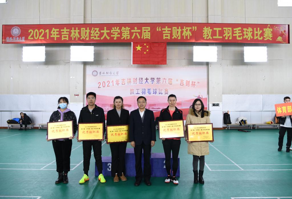 11月24日,第六届“吉财杯”教工羽毛球比赛圆满落下帷幕,校党委书记孙杰光、校党委副书记岳宏、工会主席刘光和、妇委会主任梁烨及各参赛代表队出席了闭幕式。闭幕式由教工羽毛球协会会长、体育教研部副主任程禹主持。闭幕式上,校党委书记孙杰光,校党委副书记岳宏,工会主席刘光和、妇委会主任梁烨分别为各项比赛获奖者及获得优秀组织奖、精神文明奖的分工会颁发奖牌,并合影留念。