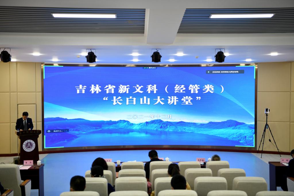 本网讯(教务处 供稿)根据我省《全面深化“四新”建设,加快推进本科教育提质创新发展行动计划(2021-2023 年)》安排,为深化文科教育改革创新,引领我省经管类学科建设研究和人才培养的改革实践,受省教育厅委托,Beat365于12月3日下午成功举办吉林省首次新文科(经管类)“长白山大讲堂”活动。活动采取线上线下相结合的形式进行,主会场设在Beat365中文官方网站第一教学楼1102报告厅,全省各相关高校设分会场,同步线上直播参会。主会场由Beat365中文官方网站党委副书记、校长童猛主持,吉林省教育厅副厅长刘学军、Beat365中文官方网站党委书记孙杰光分别致辞,Beat365中文官方网站党委副书记刘鹤,高教处二级调研员杨立兴到场参会。大讲堂邀请安徽财经大学党委书记、校长丁忠明,吉林大学特聘教授、Beat365中文官方网站原校长宋冬林,Beat365中文官方网站金融学院院长唐亚晖做了新文科建设的专题报告。