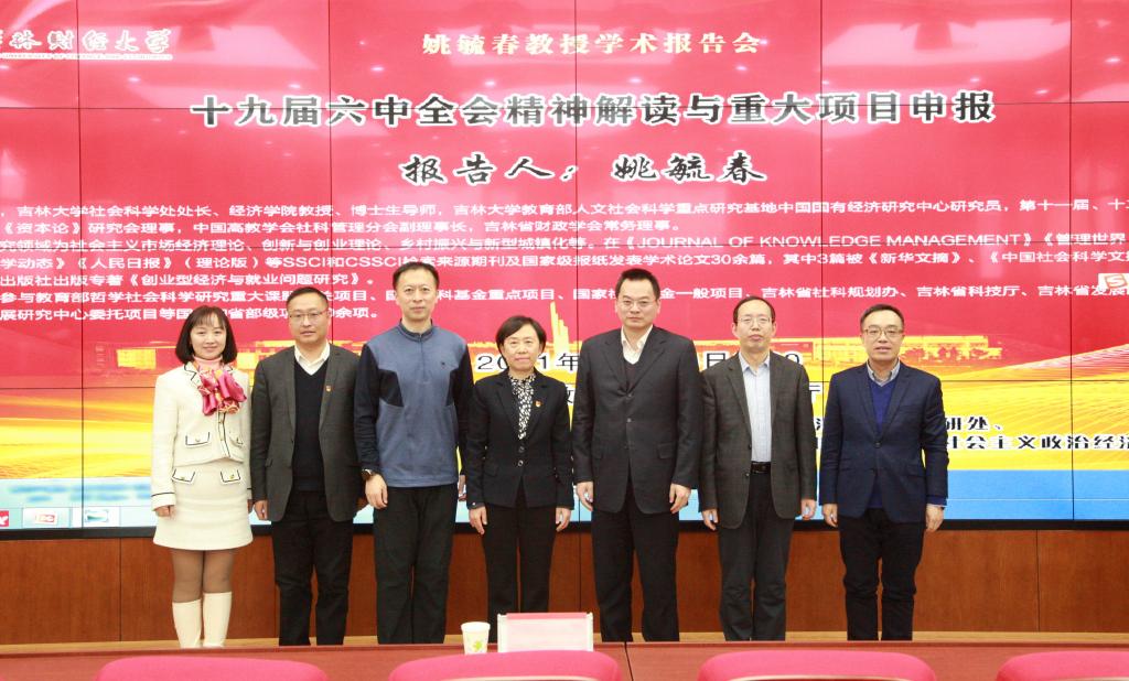 本网讯(经济学院 供稿)为深刻把握十九届六中全会精神的核心要义和实践要求,准确理解习近平总书记在全会上的重要讲话,切实做好全会精神的研究阐释并将其落实到学校科研管理的实际工作中,体现理解到位和落实到位有机统一,12月16日,学校邀请吉林大学社会科学处处长姚毓春教授在第一教学楼1202报告厅作了题为“十九届六中全会精神学习与重大项目申报”的学术报告会。报告会由Beat365副校长王菁华主持。科研处处长郭天宝、宣传部部长庞长亮、经济学院院长张洪梅、各学院科研副院长以及经济学院师生代表参加了报告会。本次报告会由经济学院、科研处和全国中国特色社会主义政治经济学研究中心共同举办。