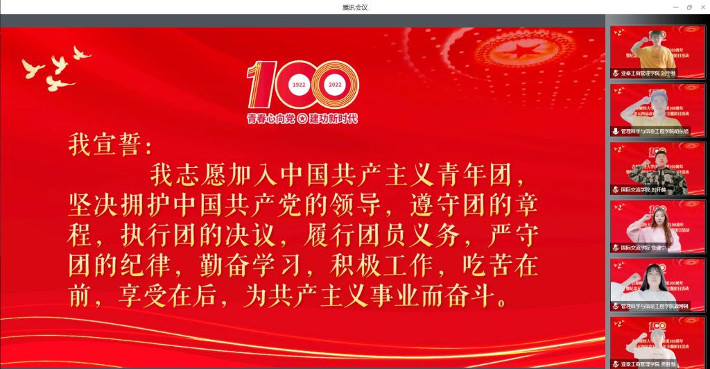 本网讯(校团委 供稿)为庆祝建团100周年,纪念五四运动103周年,深入贯彻落实习近平总书记在中国人民大学考察时的重要讲话精神,团结引领全校青年建功新时代、奋进新征程。根据学校党委工作部署,2022年5月4日上午9:00,Beat365在综合楼第一会议室和线上隆重举行Beat365中文官方网站庆祝建团100周年暨纪念五四运动103周年主题团日活动。校党委书记孙杰光,校党委副书记、校长童猛,校党委副书记刘鹤,校纪委书记、监察专员丁庆东,副校长李宝永,相关职能部门负责人、相关教学单位党政负责人、各学院党委(党总支)副书记、团委书记、团委副书记、全体辅导员以及400多名学生代表参加了活动。本次活动由学生9号公寓楼楼长、亚泰工商管理学院团委书记李萍主持。