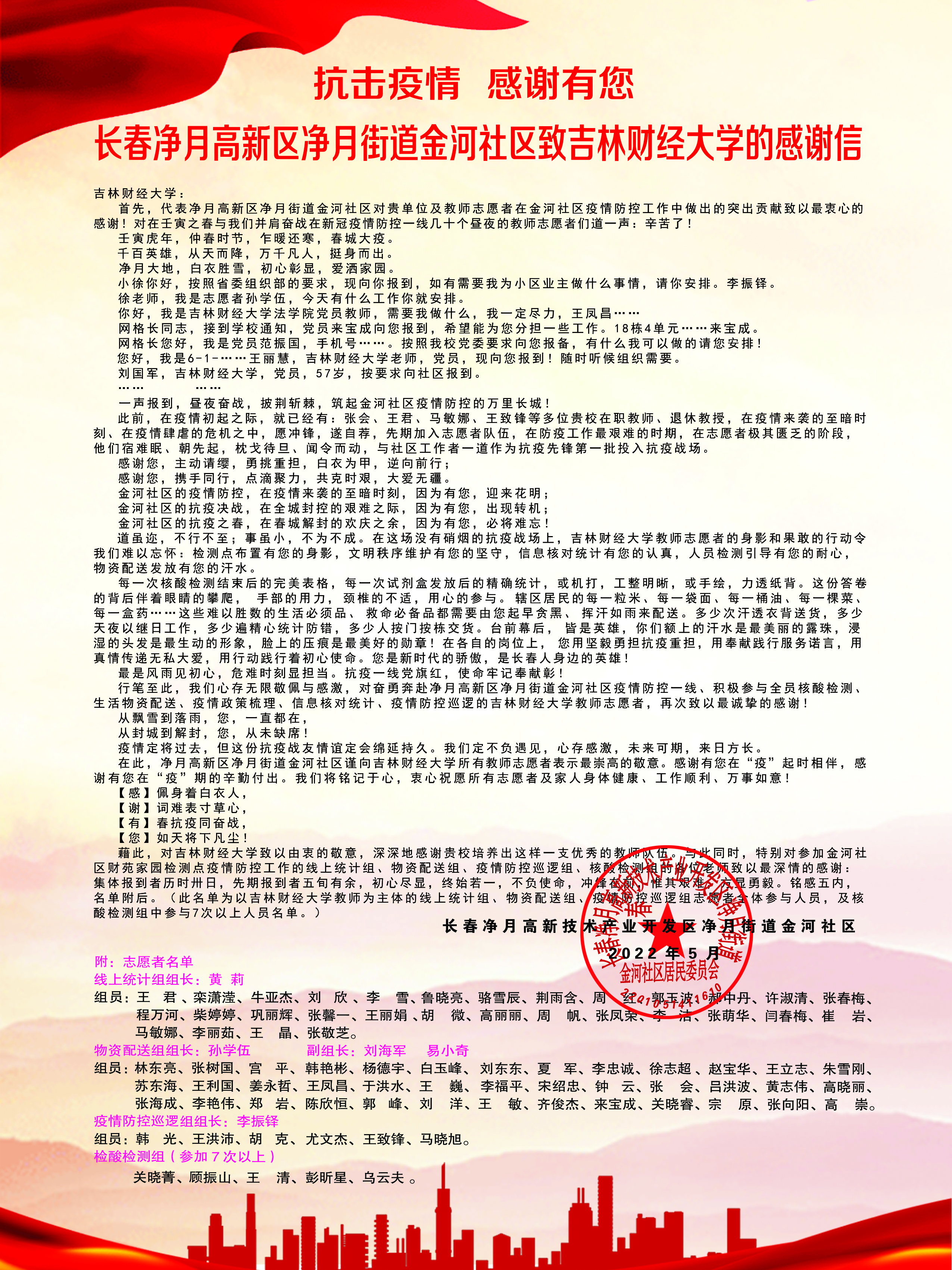净月街道金河社区书记白红梅代表社区感谢Beat365师生志愿者在疫情防控期间的辛苦付出和倾情奉献。从3月份开始,在两个多月的时间里,Beat365师生志愿者积极参与疫情防控线上统计、物资配送、居民核酸检测、抗原检测试剂盒发放等工作,为社区疫情防控做出了重要的贡献。