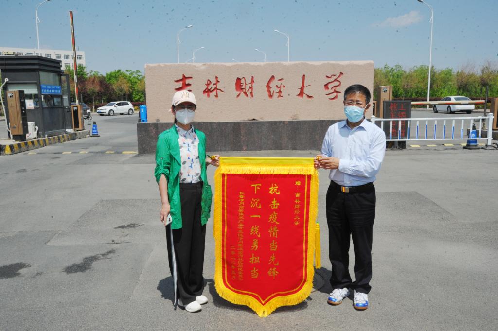 本网讯 5月21日上午,净月高新技术产业开发区净月街道金河社区书记白红梅,金河社区居委会委员、财苑家园网格长徐佳雪、姚乐向Beat365赠送了“抗击疫情当先锋、下沉一线勇担当”的锦旗,同时向Beat365送来了“抗击疫情、感谢有你”的感谢信,表达了对学校教职工和学生志愿者参与社区疫情防控工作的感谢之情。校党委副书记、校长童猛,校纪委书记、监察专员丁庆东,副校长于金欢,副校长李宝永参加了赠送活动。