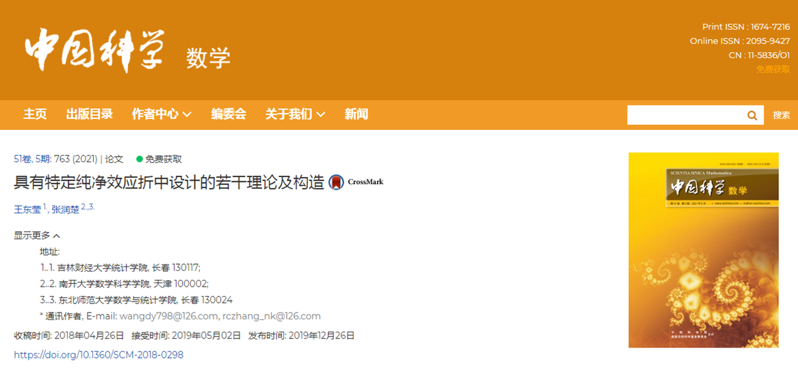 王东莹与张润楚教授主要合作开展具有特定纯净效应折中设计的若干理论及构造研究,该项研究定义了四类全新的折中设计,将纯净折中设计的分辨度拓展为III和IV,通过Yates序给出纯净折中设计的理论结果和构造方法。论文投稿后,历时一年半,于2019年12月26日首先在中国科学网络版上发表,后于2021年5月全文刊载在《中国科学:数学》第51卷第5期上。