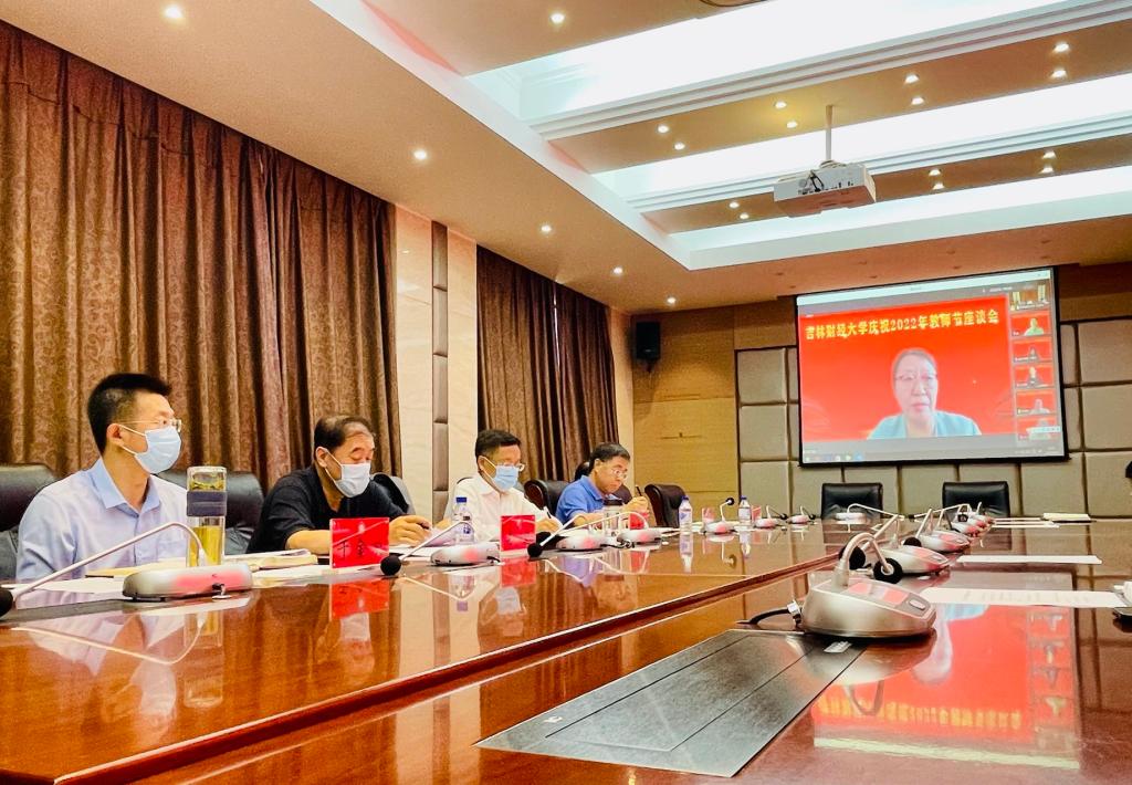 会议由校长童猛主持。他向全体教职员工、向为学校建设发展作出重要贡献的老师们和离退休老同志致以诚挚的感谢和节日的问候。他说,在统筹开展新冠肺炎疫情防控与教师节庆祝工作的情况下,组织召开这次学校各层面的教师座谈会,主要是分享大家的心得感悟和经验体会,听取大家在学校人才培养、科学研究、队伍建设等方面的宝贵意见,团结凝聚广大教师以习近平新时代中国特色社会主义思想铸魂育人,担负为党育人、为国育才使命,以实际行动迎接党的二十大胜利召开。
