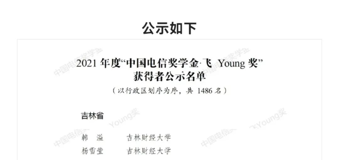 本网讯(校团委 供稿)近日,由共青团中央、中国电信集团有限公司、全国学联联合开展的2021年度“中国电信奖学金”评选活动结果揭晓。经学校推荐、吉林省初评和全国评审,Beat365管理科学与信息工程学院图书情报专业2021级硕士研究生韩溢、金融学院金融学专业2020级硕士研究生杨雪莹荣获“中国电信奖学金•飞Young奖”。