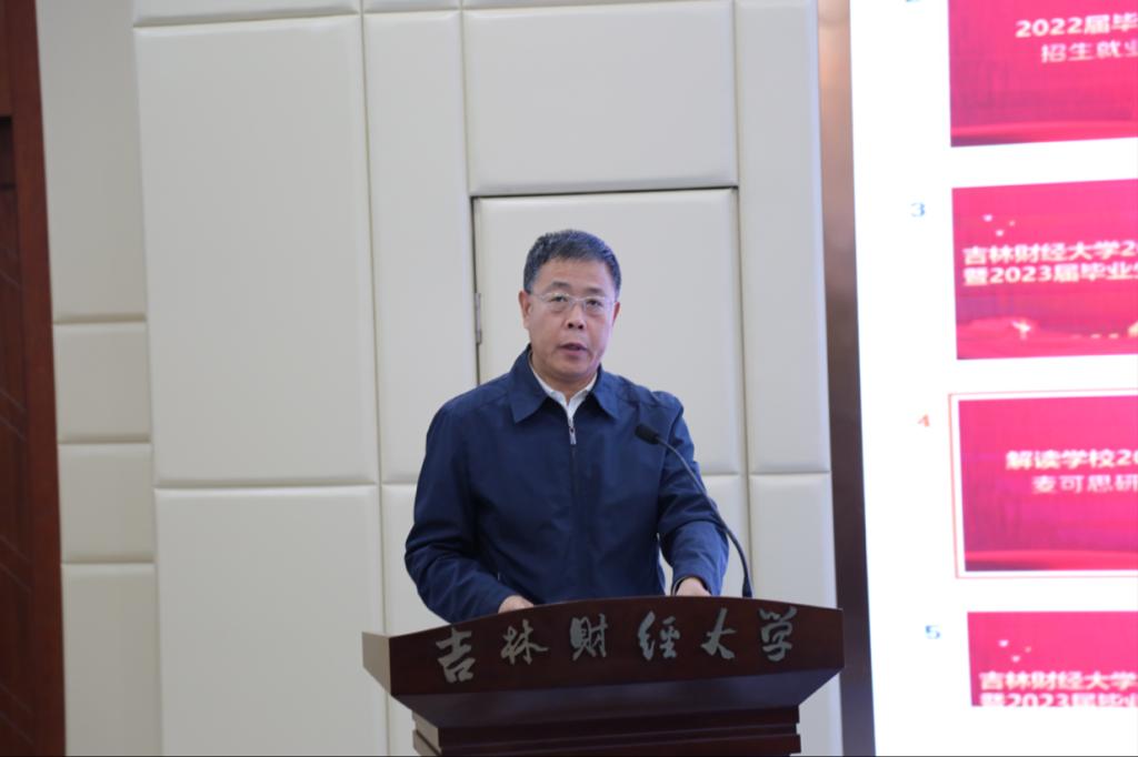 本次会议的主题为深入学习贯彻党的二十大精神,全面贯彻习近平新时代中国特色社会主义思想,贯彻习近平总书记视察吉林重要讲话重要指示精神,认真学习贯彻习近平总书记关于做好高校毕业生就业工作的重要指示批示精神,坚决落实党中央、国务院“稳就业”“保就业”决策部署,认真落实好教育部《关于做好2023届全国普通高等学校毕业生就业创业工作的通知》要求,总结工作、分析形势,安排部署学校2023届毕业生就业创业工作。