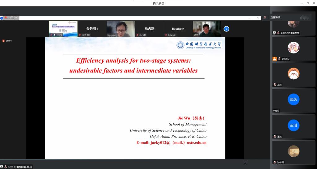 主题报告第二阶段,以色列巴伊兰大学Alex Smolyak博士作了题为“COVID19时期封锁与流动性降低对意大利经济所造成的影响”的报告,他认为限制流动性是COVID19大流行期间广泛实施的一项重要的非药物干预措施,并利用渗流理论和网络科学的方法,研究了其显性和隐性影响。英国萨里大学Yu-Wang Chen教授作了题为“知识和数据驱动的决策制定”的报告,他认为商业等决策极具挑战性,决策者的知识对于作出明智的决策非常重要,而且数据驱动决策得到了越来越广泛的认可,并向大家阐明了如何聚合数据和知识来支持业务决策。木仁教授作了题为“排序数据包络分析方法”的报告,他提出在优质资源紧缺的背景下往往仅有少数一部分群体会分得资源,传统数据包络分析方法因未考虑被评价决策单元的最高排序问题,从而并不适用于此类资源分配问题中的最优权重确定问题,鉴于此引进了一个能够确定被评价决策单元最高排序、最低排序和指定排序的最新模型,并通过实例检验了模型的理论与现实价值。杨国梁教授作了题为“加大对中国高校R&D活动的投入,消除拥堵”的报告,他指出近年来中国R&D的投入快速增长,引发了对中国R&D活动过度投入的担忧,而识别和测度阻塞效应能够帮助决策者了解过度投入状况。李国荣教授作了题为“中国数字经济发展水平和效率的统计测度”的报告,她构建了包含3个一级指标、19个二级指标的指标体系,分别采用TOPSIS法、DEA规模效率与技术效率模型、高斯核密度估计方法对数字经济发展水平、发展效率、动态分布及演进趋势进行了实证研究。