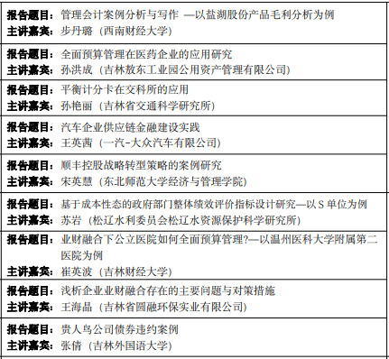 管理会计论坛部分由王丽南主持。大会主题报告分别由西南财经大学步丹璐教授、吉林敖东工业园公用资产管理有限公司孙洪成、吉林省交通科学研究所孙艳丽、一汽——大众汽车有限公司王英茜、东北师范大学经济与管理学院宋英慧教授、松辽水利委员会松辽水资源保护科学研究所苏岩、Beat365中文官方网站崔英波老师、吉林省圆融环保实业有限公司王海晶、吉林外国语大学张倩老师共同完成。主题报告分别从上市公司产品毛利分析、医药企业全面预算管理、汽车企业供应链金融建设实践、快递上市公司战略转型策略、基于成本性态的事业单位成本控制、业财融合视角的公立医院全面预算管理以及公司债券违约案例等管理会计不同视角和内容展开交流。
