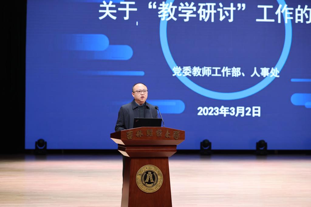 在校领导交流的第二阶段,校党委副书记、校长童猛为全校教师做了“学思悟践---奋力推动‘育人立校’走新走深”报告。他指出,在开学之初专门安排一天半时间来做大研讨总结与交流,请老师做主角,同时校领导都来讲,全员动员、全员参与、交流思想、提振精神,以此开篇别有意义。他对总结报告和大家的交流发言给予充分肯定,并从“评、述、做”三个方面做交流发言。作为“评”,他认为对照开初部署要求,大研讨做到了动真格和负责任,基本达到了预期目的;在“述”中,他讲了校长带头做教育教学工作“述职”,是兑现“承诺”。他从学和做两方面谈了自己一年来推动教育教学和参与大研讨的情况,谈了学习贯彻习近平总书记关于教育的重要论述的心得,并向与会人员分享了学习《回归大学之道》《优秀的绵羊》《大学的改革》《理解教与学——高校教学策略》《如何成为卓越的老师》等书籍和文章的感悟,强调学以致知、学以致用;在“做”中,他要求全校上下要深刻领会习近平总书记关于教育的重要论述,深入学习贯彻党的二十大精神,学习贯彻全国教育大会以及本科教育工作会精神,“行有不得,反求诸己”,从学习理论和调查研究入手,以知促行、以行促知、知行合一,以改革来破题答卷。他最后勉励大家,要牢记习近平总书记要求“对教师来说,想把学生培养成什么样的人,自己首先就应该成为什么样的人。”做仁而爱人的好教师,做聚焦贡献、向上管理的卓有成效的管理者,共同努力建设国内一流财经大学。