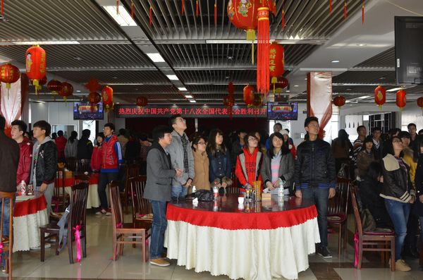与此同时,学校相关部门和各学院也组织本单位教职工和学生通过网络、电视、广播等媒介收看收听十八大开幕会直播。在学生宿舍和餐厅,许多同学聚在电脑、电视前,兴致勃勃地收看大会。大家一边观看,一边交流着自己的心得体会。