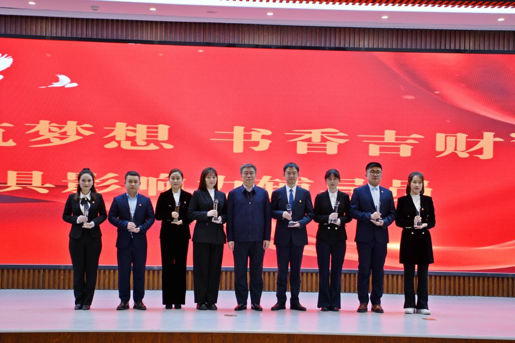 刘鹤向“党旗领航”工程——“辅导员成长计划5+2,领航梦想书香吉财”阅读推广工作最具影响力获奖辅导员代表发放了奖杯。